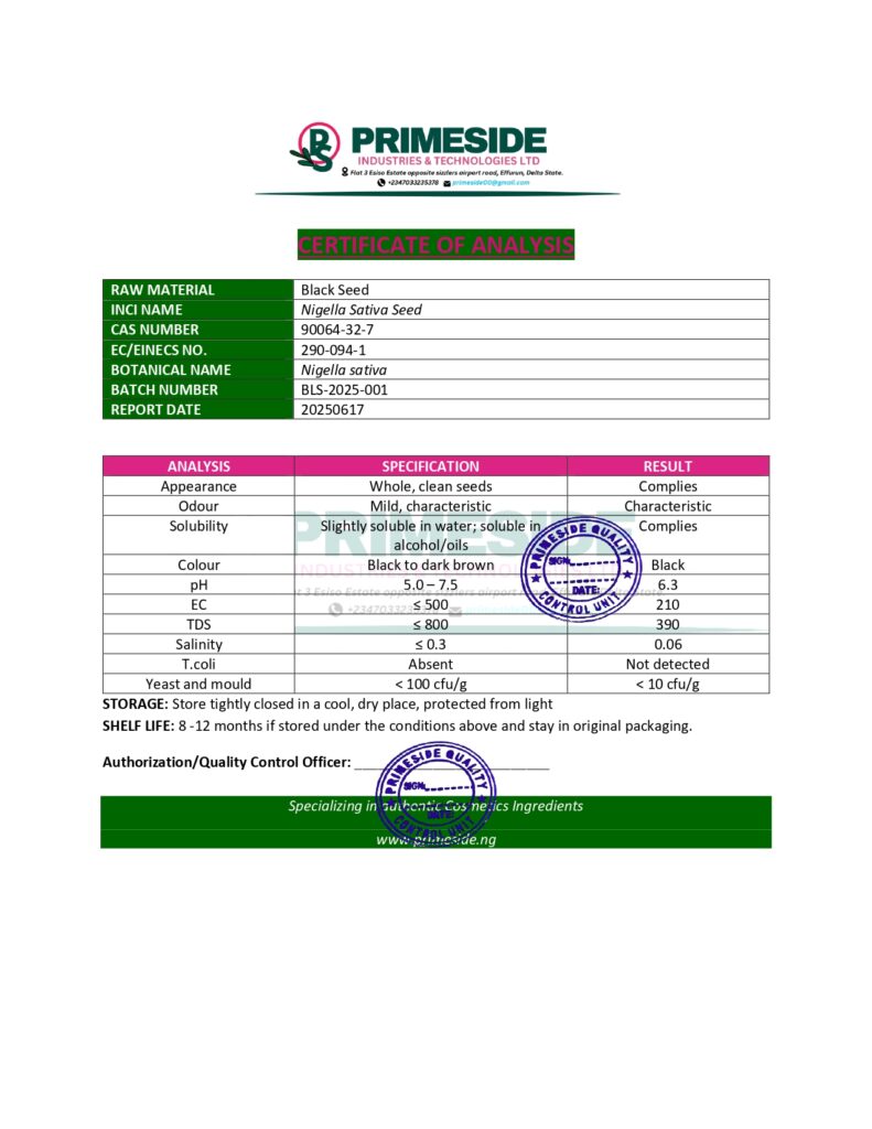 - Nigella Sativa Seed (raw form): 68606-07-5