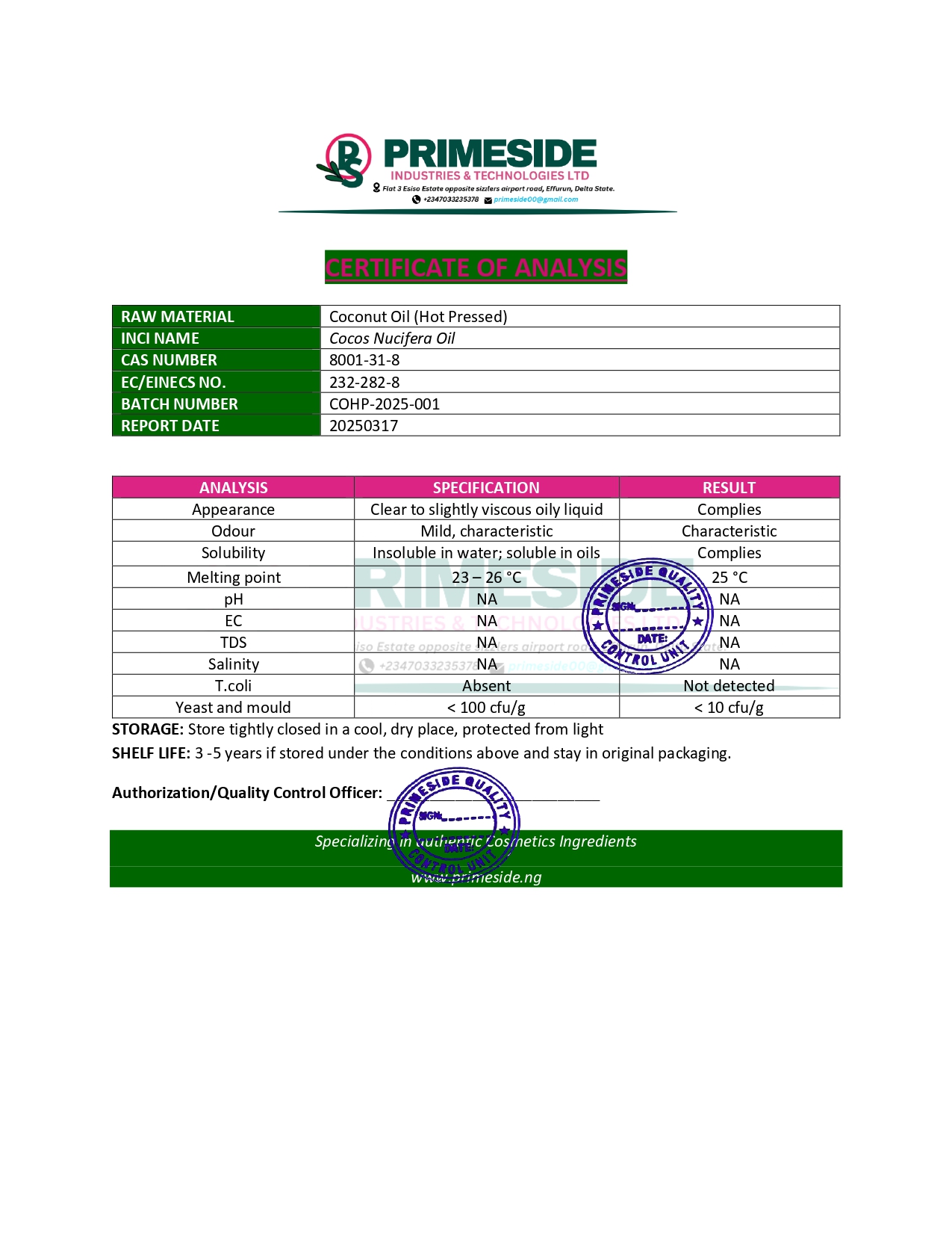 Coconut Hot Pressed Oil is a natural, cold-processed oil extracted from dried coconut meat (Cocos nucifera) that provides moisturizing, antimicrobial, and anti-inflammatory benefits.