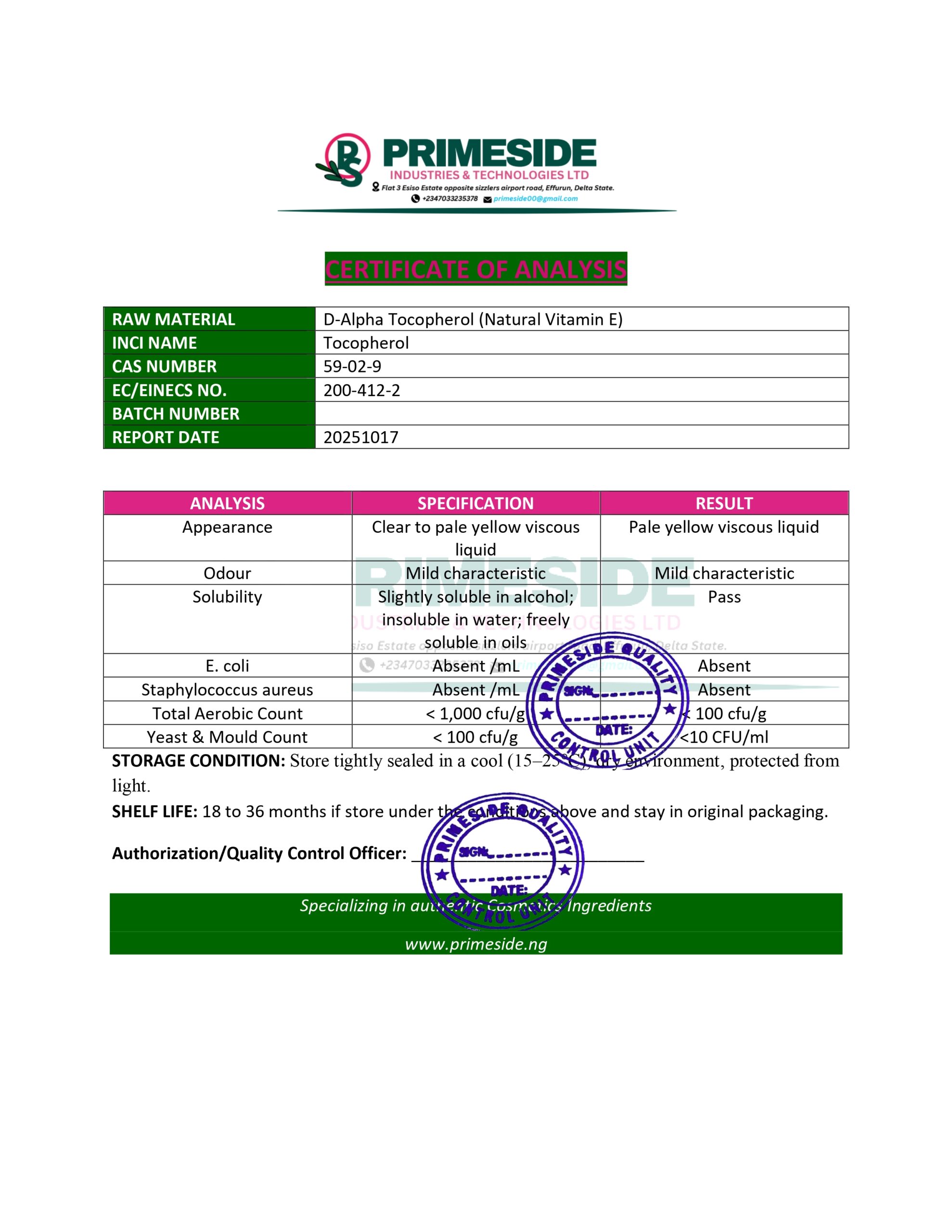 D-Alpha-Tocopherol is the naturally occurring, biologically active form of Vitamin E. It is a powerful antioxidant that helps protect the skin from free radicals, supports skin barrier function, and helps improve the appearance of skin texture and hydration. It is derived primarily from vegetable oils.