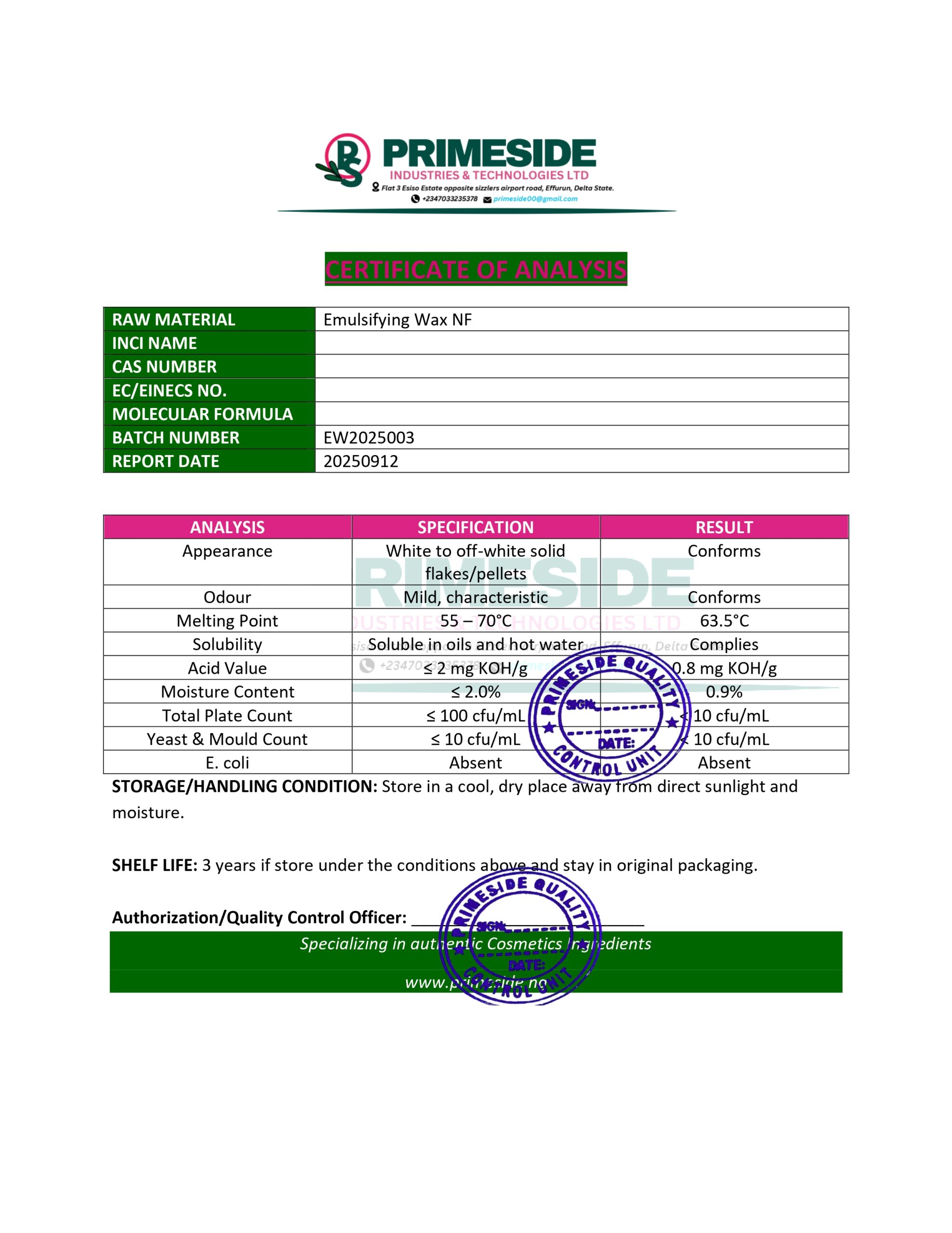 Emulsifying Wax NF is a commonly used emulsifier in cosmetics and personal care products. It is a blend of fatty alcohols and emulsifiers derived from natural sources like vegetable oils. This wax is used to combine oil and water-based ingredients, forming smooth, stable emulsions such as creams, lotions, and ointments.