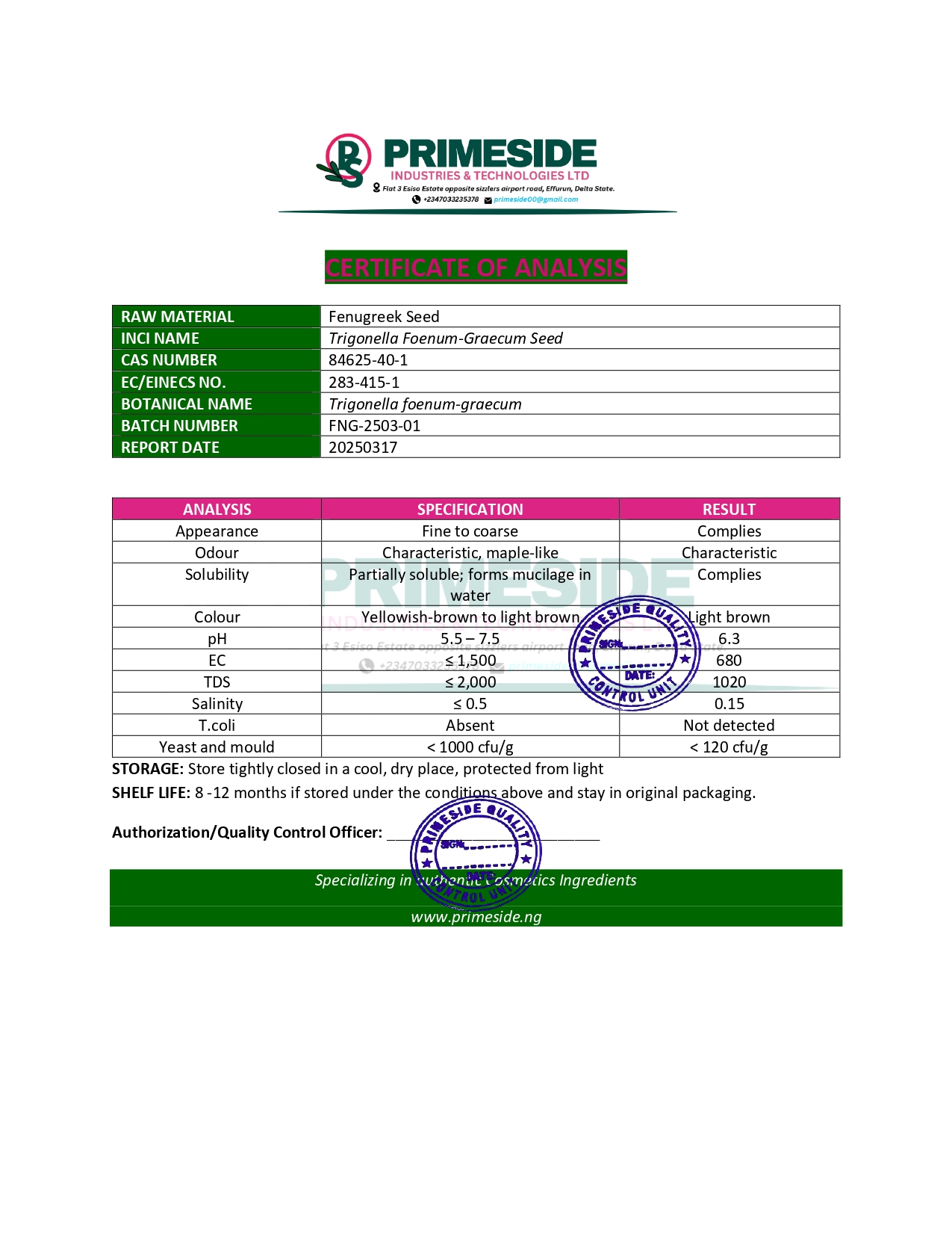 - 8049-07-6 (for fenugreek seed oil)