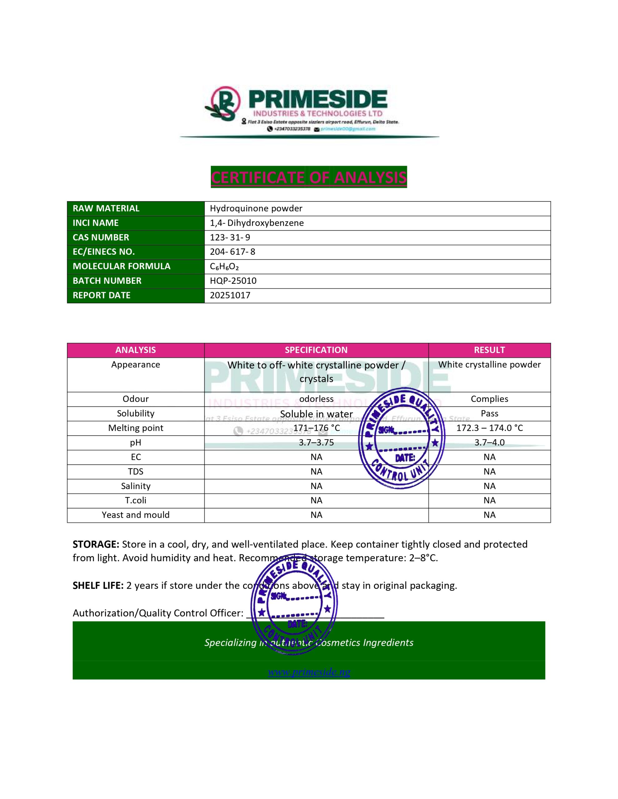 Hydroquinone Powder is a chemical compound primarily used in various skincare products, as well as in industrial applications.