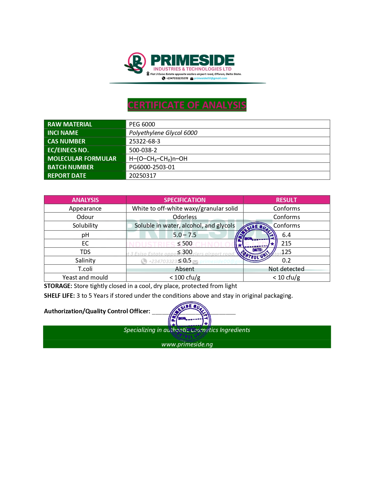 PEG 6000 is a safe, multifunctional ingredient primarily used as a solubilizer, binder, thickener, humectant, and emollient enhancer. It’s a high-molecular-weight polyethylene glycol (PEG), which means it’s not readily absorbed by the skin — making it useful in topical formulations where barrier function or solubilizing action is needed.