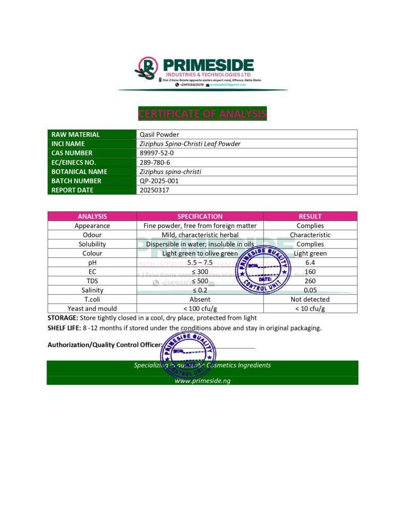 Qasil Powder is not typically listed under a formal INCI (International Nomenclature of Cosmetic Ingredients) name, but its scientific name could be Aristolochia Albida (the plant from which it’s derived).
