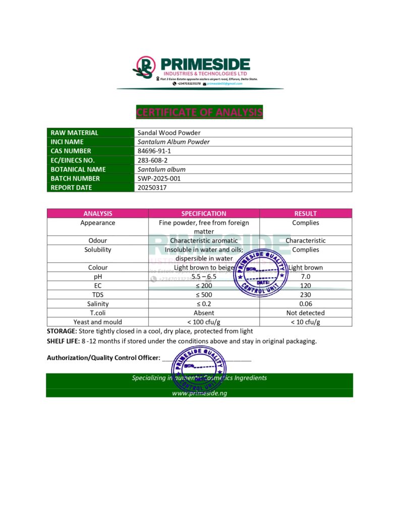 Solubility: Sandalwood powder is oil-soluble and can be incorporated into oil-based formulations like creams, oils, and balms. It has limited solubility in water, which makes it more suitable for use in emulsions or oil-based skin treatments.
