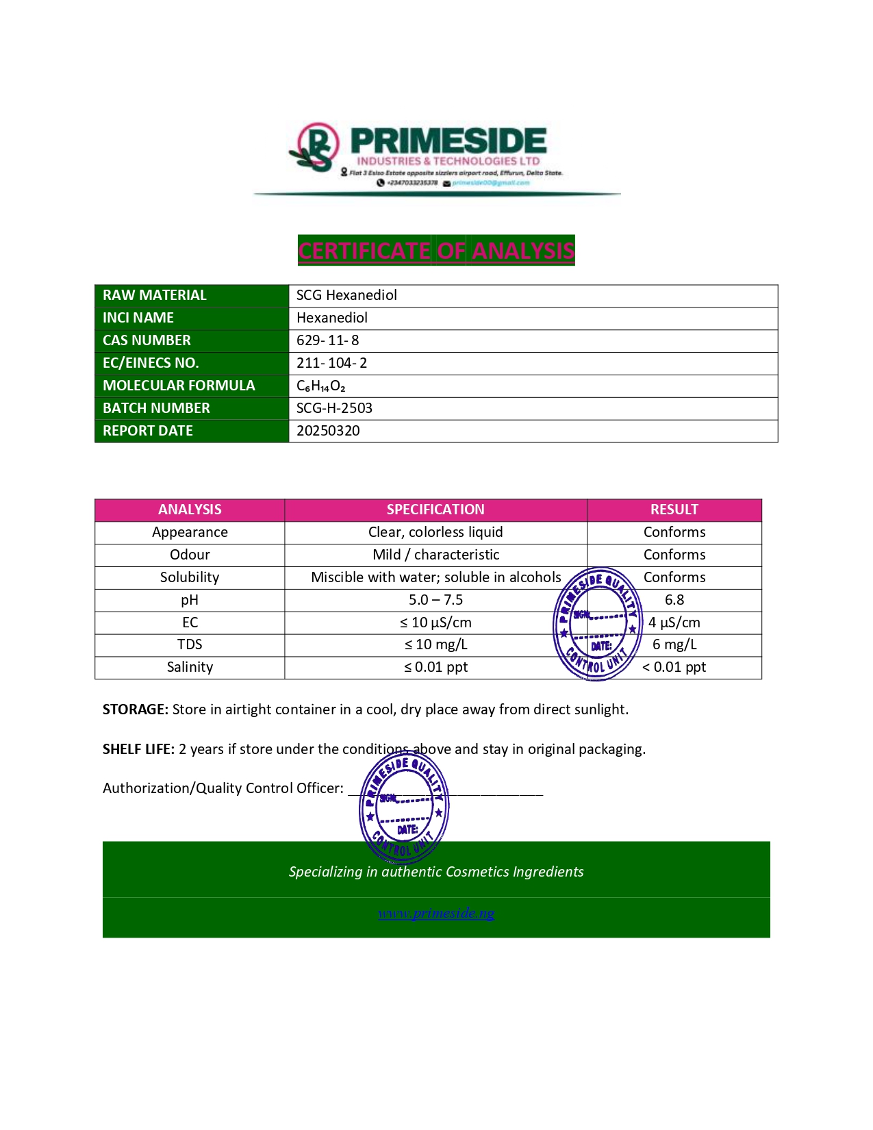- Country of Origin: SCG Hexanediol is produced in various countries, including South Korea, China, and the United States, where it is synthesized for use in the global cosmetics industry.