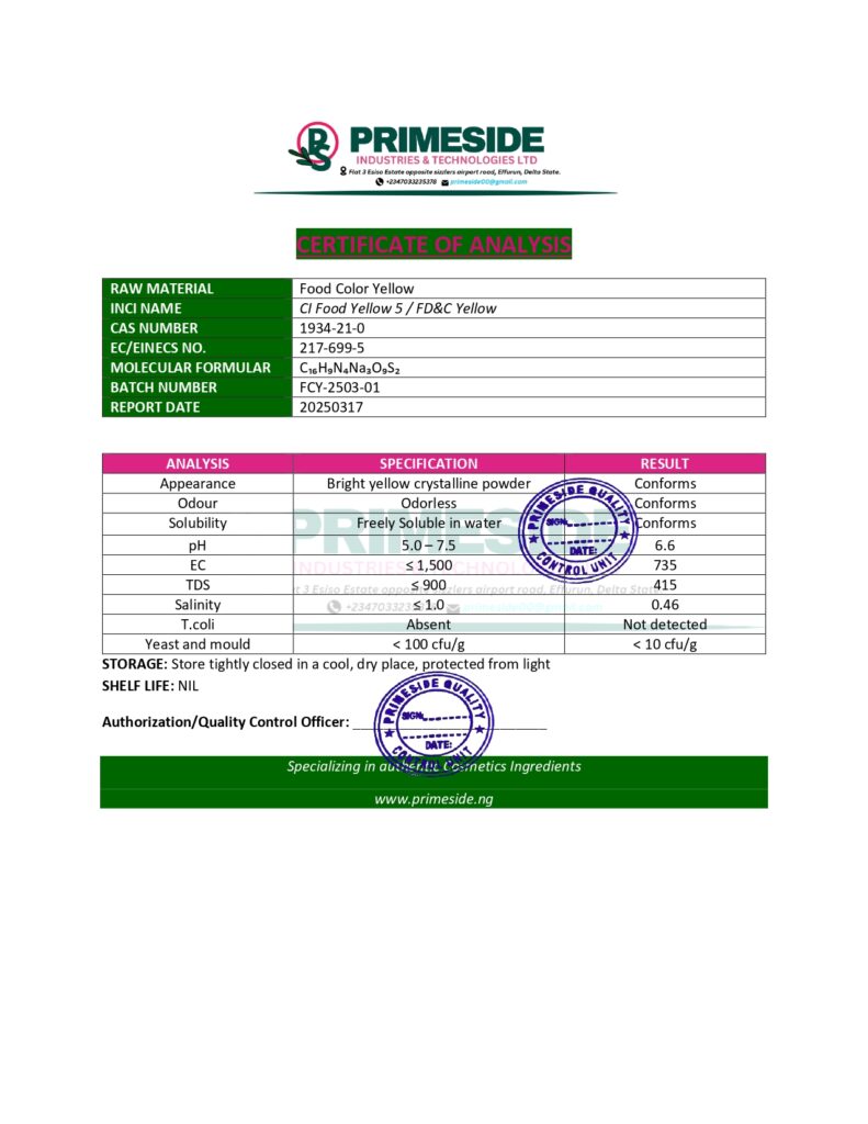 Yellow Food Color is a commonly used colorant that imparts a vibrant yellow hue to a variety of food and beverage products. It can be derived from both synthetic and natural sources, and it is used to create visually appealing products in a wide range of categories, including confectionery, beverages, baked goods, and savory foods.